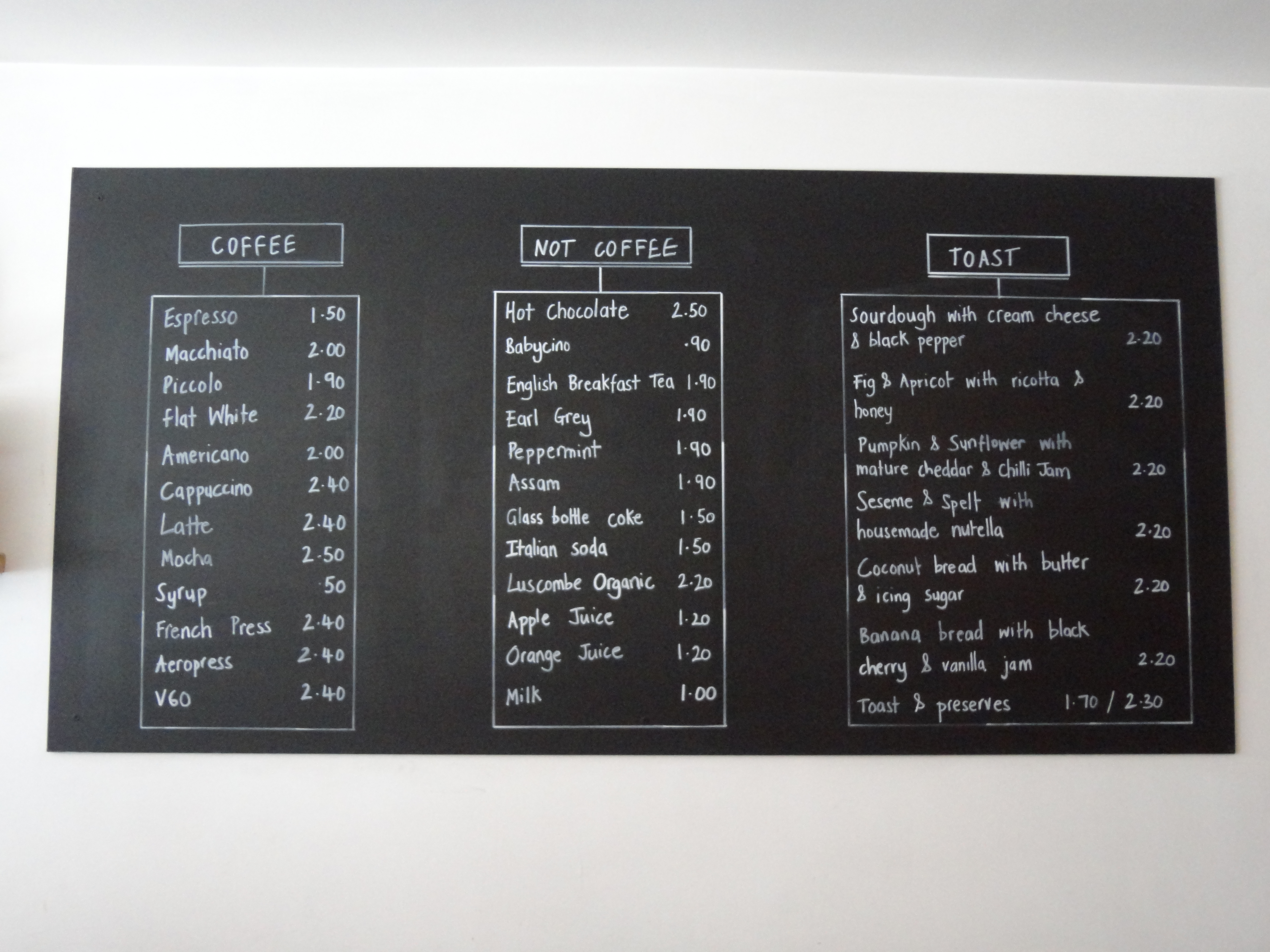 • The coffee – beautiful coffee sourced from the best independent coffee roasters. The coffee is expertly made and freshly ground to order. Pots of tea are also available, as well as cold drinks.DSC07955DSC07957DSC07956Unknown